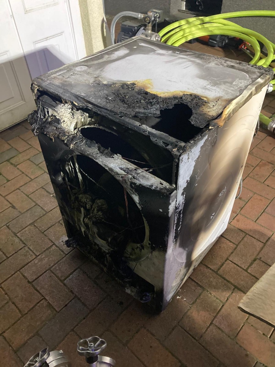 Noch während dieser Einsatz lief, ging um 01:24 Uhr eine weitere Alarmierung ein. In der Westfalenstraße war es zu einem Kellerbrand in einem Wohnhaus gekommen. Beim Eintreffen der Feuerwehr hatten alle Bewohner das Gebäude bereits unverletzt verlassen. Ursache des Brandes war ein Wäschetrockner im Keller, der durch die eingesetzten Löschzüge 2, 3 und 5 schnell abgelöscht und anschließend ins Freie gebracht wurde. Der Hausbesitzer hatte zuvor die Kellerabgangstür geschlossen, wodurch sich der Rauch nicht im Gebäude ausbreiten konnte. Das Wohnhaus blieb dadurch bewohnbar.