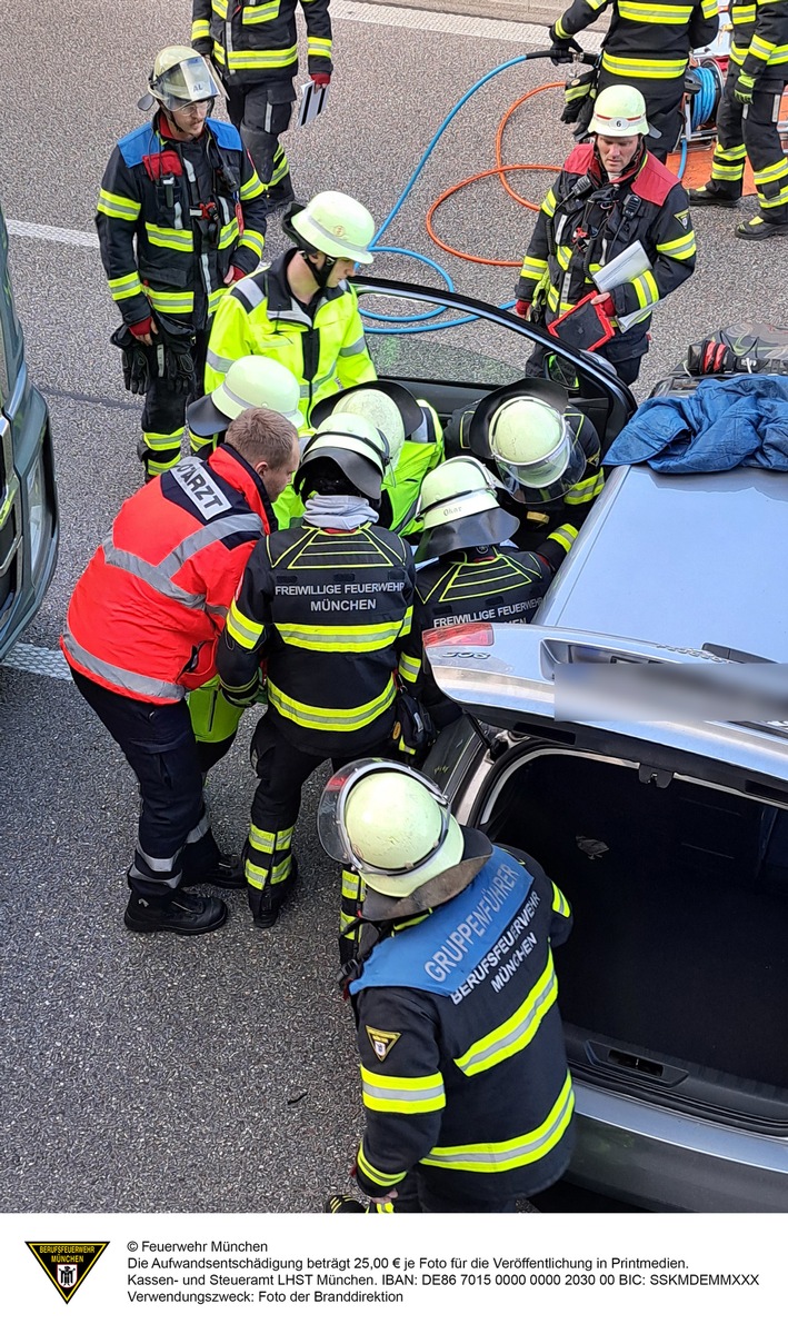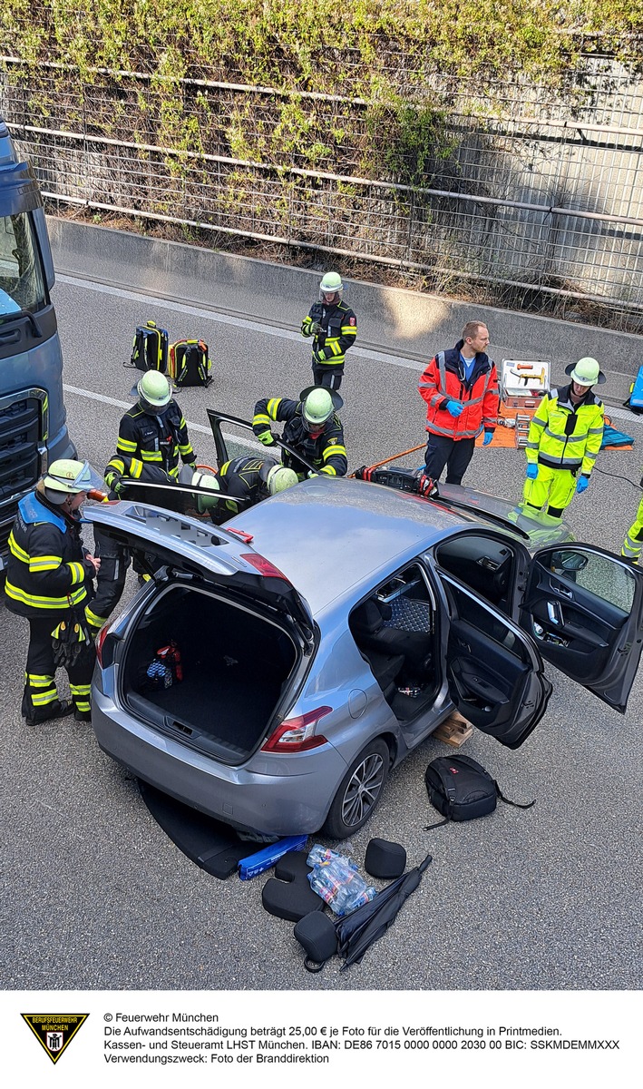 Kurz nach dem Allacher Tunnel in Fahrtrichtung Salzburg kollidierten die beiden Fahrzeuge seitlich auf der mittleren von drei Spuren. Der silberne Peugeot wurde hierbei auf der Fahrerseite getroffen. Während der 29-jährige Lkw-Fahrer unverletzt aussteigen konnte, blieb der 43-jährige Lenker des Autos bis zum Eintreffen der alarmierten Rettungskräfte sitzen. Nach der Beurteilung durch einen Notarzt wurde der als mittelschwer verletzt eingestufte Mann möglichst schonend aus dem Fahrzeug befreit. Hierzu entfernten die Einsatzkräfte mit hydraulischem Gerät die B-Säule und schafften so eine sogenannte große Seitenöffnung. Mit einem Wirbelsäulenbrett konnte der Mann schließlich in den Rettungswagen und anschließend in eine Münchner Klinik gebracht werden.