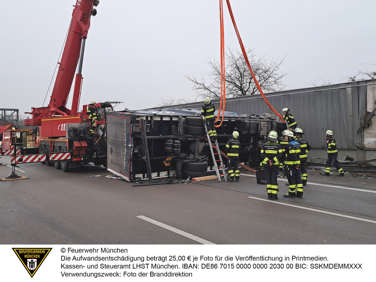 Ein Sattelauflieger war auf einen verkehrsbedingt bremsenden Lkw aufgefahren, der dadurch umkippte und quer über zwei Fahrspuren und dem Standstreifen zum Liegen kam. Dabei wurde die angrenzende Lärmschutzwand in Teilen stark beschädigt. Der zweite Lkw kam schwer beschädigt im Bankett an der Mittelleitplanke zum Stehen.