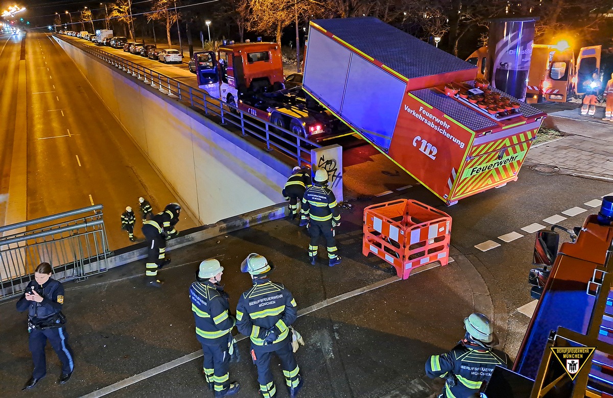 Da der BMW nach dem Unfall aber ein Brückengeländer der Tivolistraße über der Ifflandstraße stark beschädigt hatte, bestand die Gefahr, dass hier weitere Teile auf die Straße herabfallen. Daher entschieden die Einsatzkräfte der Feuerwehr und der Polizei, das beschädigte Bauteil zu entfernen. Herzu schnitten die Einsatzkräfte die verbliebenen Verbindungen zum Geländer ab und entfernten dieses dann. Um den Bereich zu sichern, wurde der Abrollbehälter Verkehrsabsicherung zur Einsatzstelle beordert. Der Bereich wurde so mit Absperrmaterial gesichert.