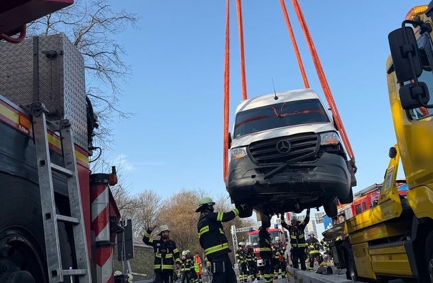 Die Integrierte Leitstelle der Feuerwehr alarmierter daher gegen 8 Uhr den Feuerwehrkran sowie einen Rüstwagen zur Bergung des Kleintransporters. Unter Anleitung der Spezialisten für schwere technische Hilfeleistung wurde zunächst die Schräglage des Unfallfahrzeuges mit Lufthebekissen ausgeglichen. Im Anschluss hob der Kran den Kleintransporter von der Mittelleitplanke und übergab diesen dem Abschleppdienst. So konnten die Einsatzkräfte die Unfallstelle nach circa drei Stunden wieder verlassen und diese der Polizei übergeben. Insgesamt waren 25 Feuerwehreinsatzkräfte vor Ort.