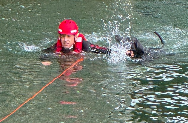 Die hinzugerufene Feuerwehr setzte speziell ausgebildete Strömungsretter ein. An einer Leine gesichert schwamm ein Feuerwehrtaucher zu dem verängstigten Vierbeiner. Nach einer kurzen Kennenlernphase auf dem Vorsprung des Wehrs traten Retter und Tier die Schwimmstrecke zurück ans Festland an. Dort konnte der Hund in die freudigen Arme seiner Besitzerin übergeben worden.