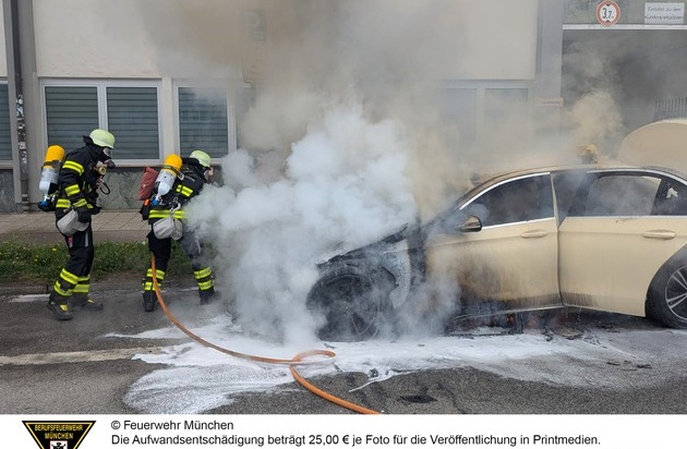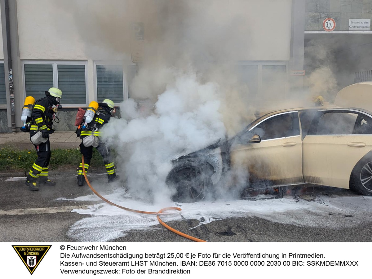 Die auf einem Parkstreifen abgestellte Mercedes Limousine hatte aus unbekannter Ursache angefangen, im Motorraum zu brennen. Ein zufällig vorbeifahrendes Einsatzfahrzeug der Feuerwehr München wurde auf das Feuer aufmerksam und alarmierte weitere Kräfte. Die sofort eingeleiteten Erstmaßnahmen mit einem Feuerlöscher blieben jedoch erfolglos. Als die Einsatzkräfte eines Hilfeleistungslöschfahrzeugs eintrafen, stand das dieselbetriebene Fahrzeug bereits in Vollbrand. Sofort wurden Löschmaßnahmen unter schwerem Atemschutz und dem Schnellangriff eingeleitet. Nach kurzer Zeit waren die Flammen unter Kontrolle. Um auch letzte Glutnester abzulöschen, wurde im Einsatzverlauf auch Löschschaum verwendet. Ein weiterer Trupp kontrollierte zeitgleich ein angrenzendes Gebäude, ob Rauch eingedrungen war.