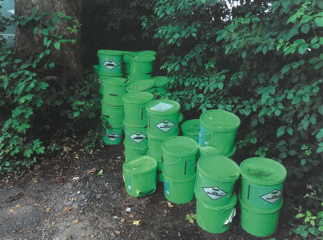 Unbekannte hatten am vergangenen Wochenende 84 Eimer eines Teppichklebers illegal an der Mindener Straße, an der Bachstraße und Auf dem Draap entsorgt.