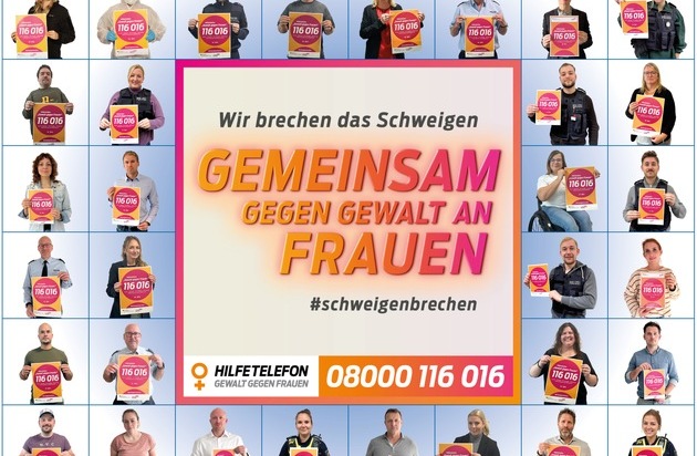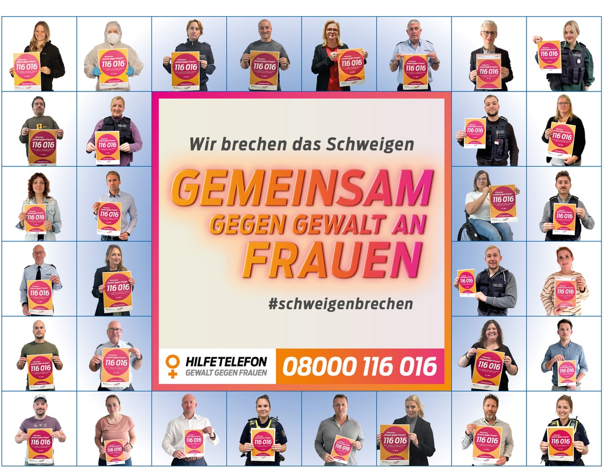Die Polizei Düsseldorf beteiligt sich mit einer Fotoaktion am Internationalen Tag gegen Gewalt an Frauen, um gemeinsam mit dem Hilfetelefon "Gewalt gegen Frauen" auf Angebote aufmerksam zu machen und an Betroffene zu appellieren: Brechen Sie ihr Schweigen!