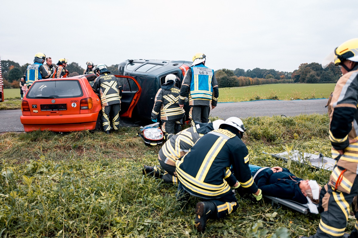 Am Samstag, den 11. Oktober 2025, wurde die Feuerwehr Hünxe um 13 Uhr mit dem Einsatzstichwort "Busunfall" alarmiert. Auf der Straße An den Höfen im Ortsteil Bruckhausen war es zu einem folgenschweren Verkehrsunfall gekommen. Ein mit mehreren Fahrgästen besetzter Linienbus geriet außer Kontrolle, nachdem der Busfahrer offenbar einen medizinischen Notfall erlitten hatte. In der Folge kam der Bus von seiner Fahrspur ab. Mehrere entgegenkommende Fahrzeuge versuchten auszuweichen, um eine Kollision zu verhindern. Dabei kam es zu mehreren Kollisionen, insgesamt waren fünf Pkw verunfallt. Mehrere Personen wurden als verletzt, eingeklemmt oder eingeschlossen gemeldet.