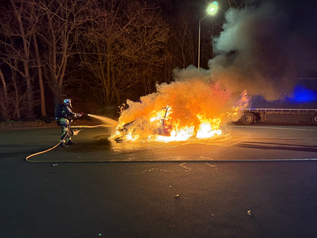 FW Hünxe: Pkw in Flammen - Fahrzeugbrand auf Rastplatz