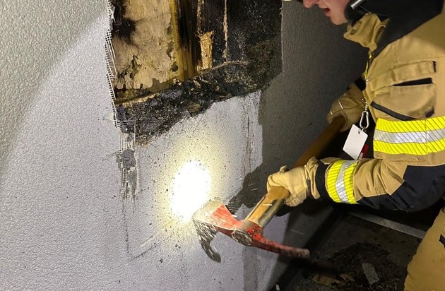 Um einen Kleinbrand in einer Fassade zu erreichen, musste diese gewaltsam geöffnet und das glimmende Dämmmaterial entfernt werden. Die Fassade wurde im Anschluss gekühlt.