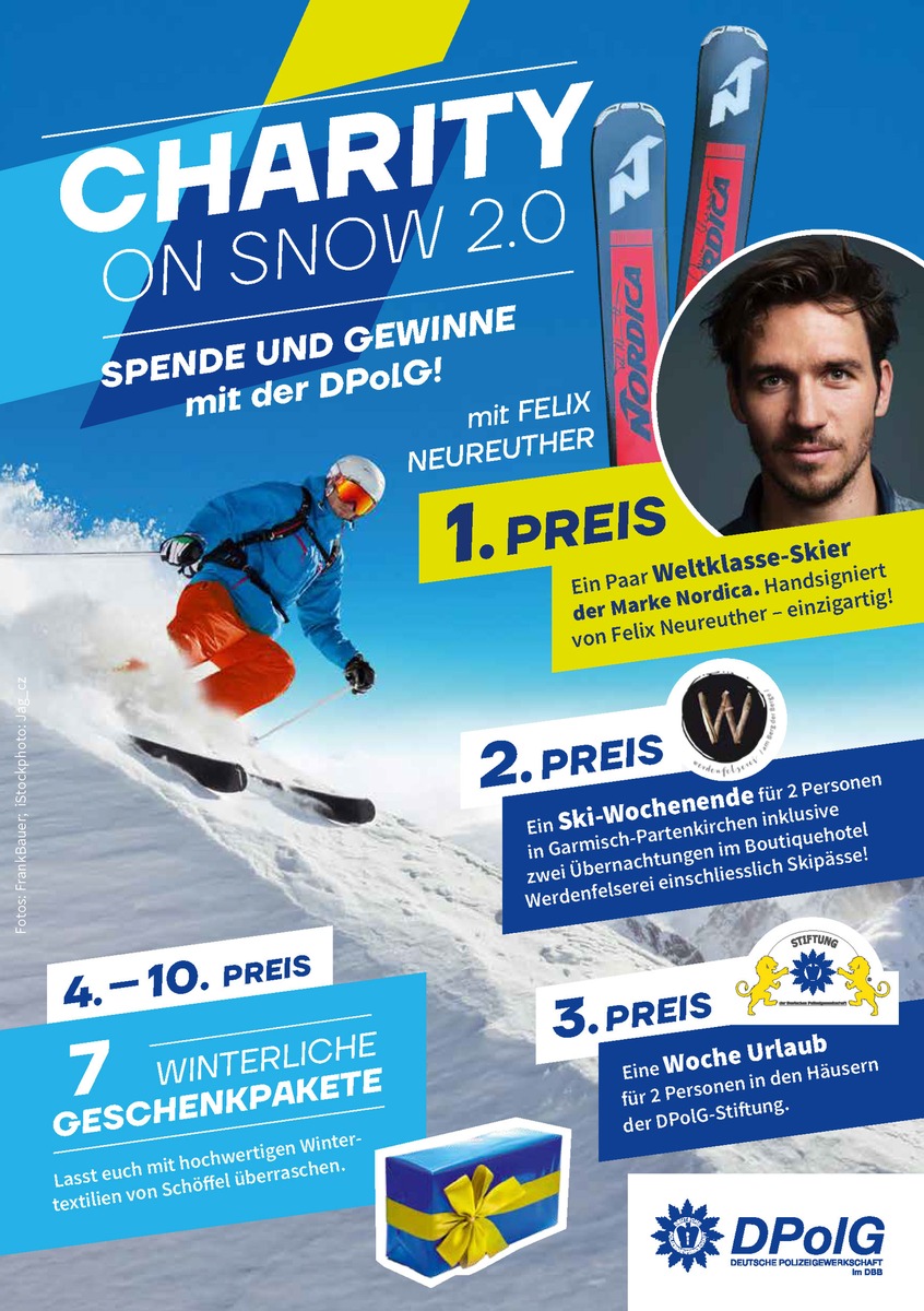 Teilnehmen kann jeder, der bis zum 6. Januar 2026 eine Spende in einer Mindesthöhe von 10 Euro tätigt. Alle Spender kommen dann in den Lostopf. Die Gewinner werden kurz danach gezogen und benachrichtigt. Spenden bitte auf folgendes Konto: Stiftung der Deutschen Polizeigewerkschaft Sparda Bank München eG IBAN: DE70 70090500 0001999 990 BIC: GENODEF1S04 Verwendungszweck: "CHARITY ON SNOW 2.0" + Kontaktdaten (Adresse/Telefonnummer)