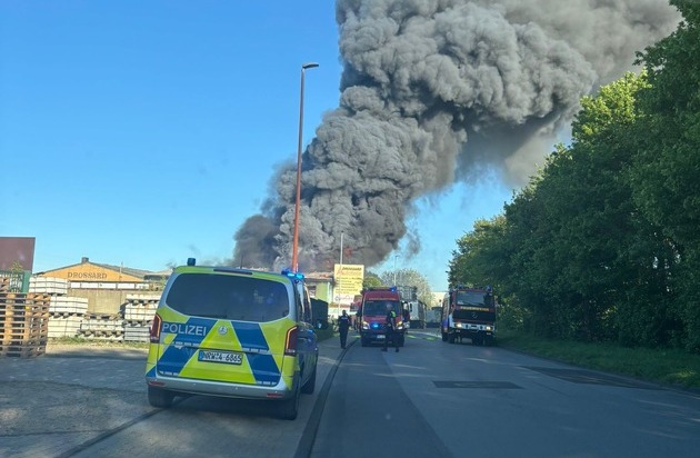 Auf dem Gelände eines Schrotthofes ist es zu einem Brand gekommen. Die Feuerwehr ist mit allen verfügbaren Kräften im Einsatz. Die Rauchentwicklung ist weithin sichtbar.