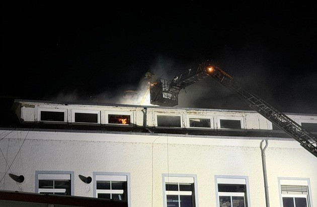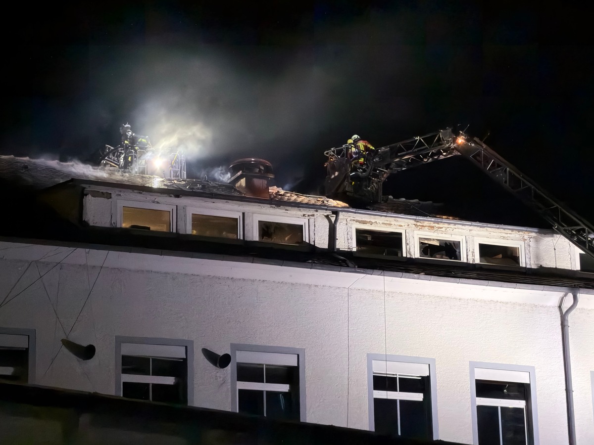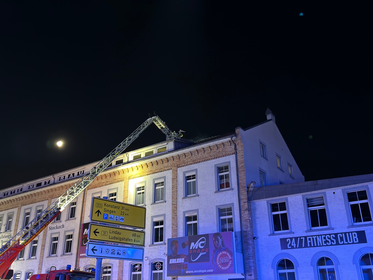 Am 02.04.2026 um 2:30 Uhr wurde die Feuerwehr Stockach Abteilung Kernstadt mit dem Einsatzstichwort "B3 Brand im Gebäude" in die Heinrich-Fahr-Straße in Stockach alarmiert. Beim Eintreffen der Einsatzkräfte waren in einem 3-stöckigen Geschäftsgebäude Flammen im Bereich des obersten Stockwerks sichtbar.