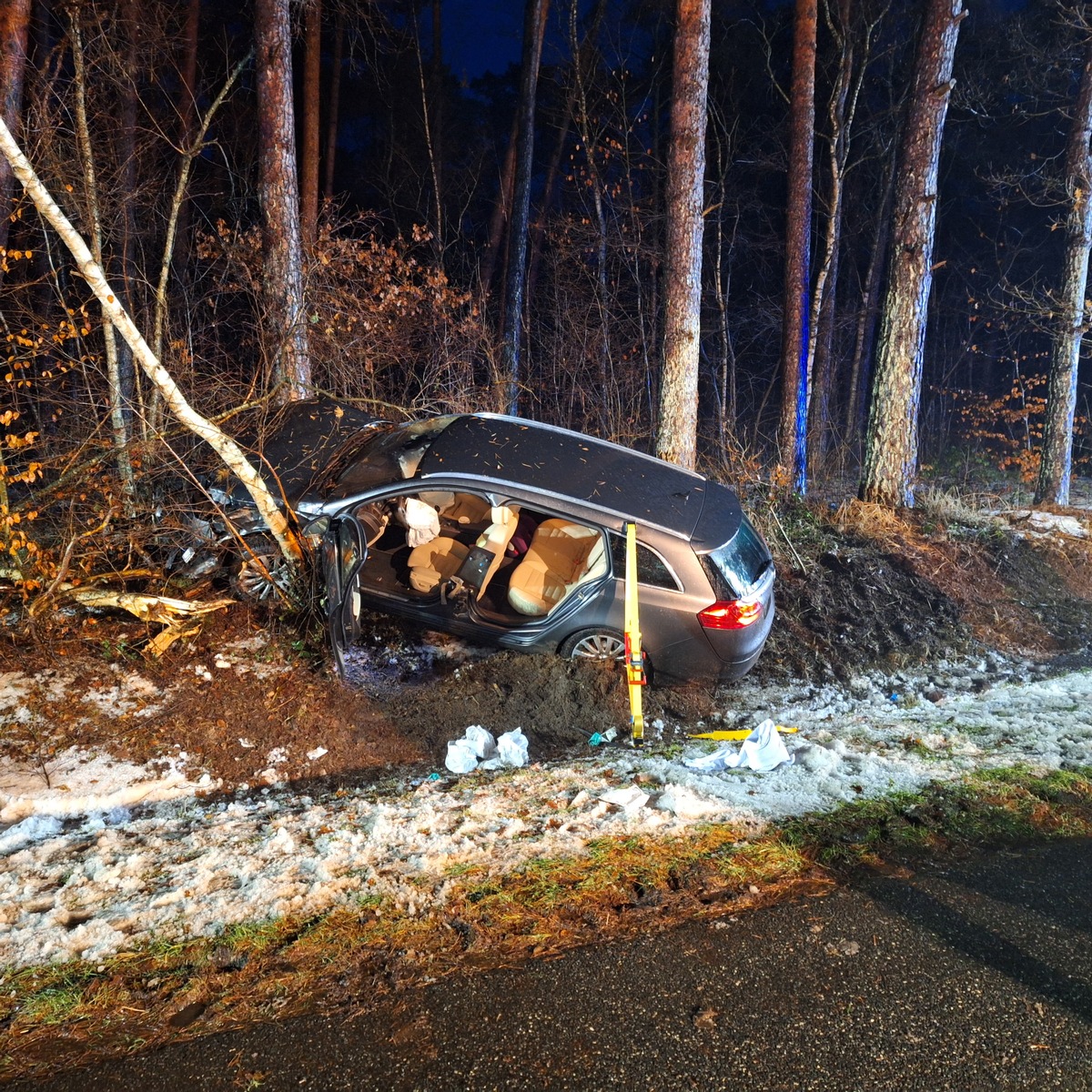 Die Feuerwehr Hellwege sperrte die Kreisstraße für die Dauer der Rettungs- und Aufräumarbeiten vollständig ab, stellte den Brandschutz sicher und leuchtete die Einsatzstelle aus. Insgesamt waren sieben Einsatzfahrzeuge mit 29 Einsatzkräften im Einsatz. Nach der Rettung wurde die Fahrzeugbatterie abgeklemmt. Zudem entfernte die Feuerwehr einen Baum, der infolge des Unfalls umzustürzen drohte.