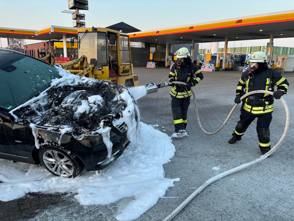 Gegen 6.20 Uhr geriet am Donnerstagmorgen aus ungeklärter Ursache ein Mercedes-Benz Kombi auf einem Autorasthof in der Hansestraße in Brand. Der Fahrer hatte auf der Autobahn bemerkt, dass etwas mit dem Auto nicht stimmt. Daraufhin fuhr er von der Autobahn ab. Auf dem Parkplatz des Autohofes geriet das Fahrzeug schließlich in Brand.