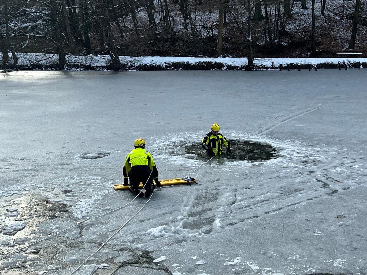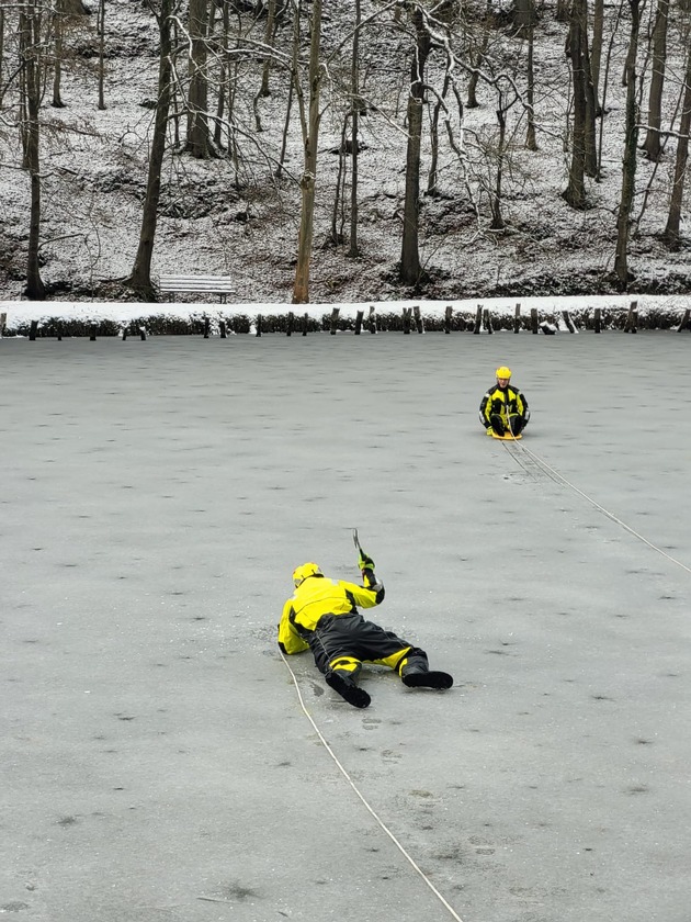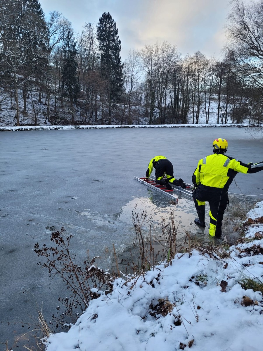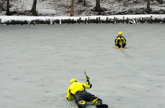 FW Hennef: Feuerwehr Hennef übt Menschrettung auf zugefrorenem Teich