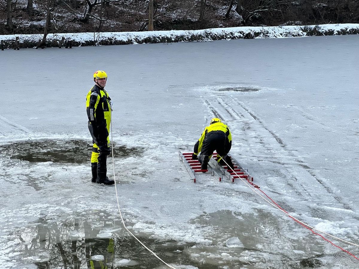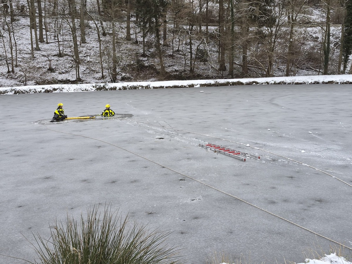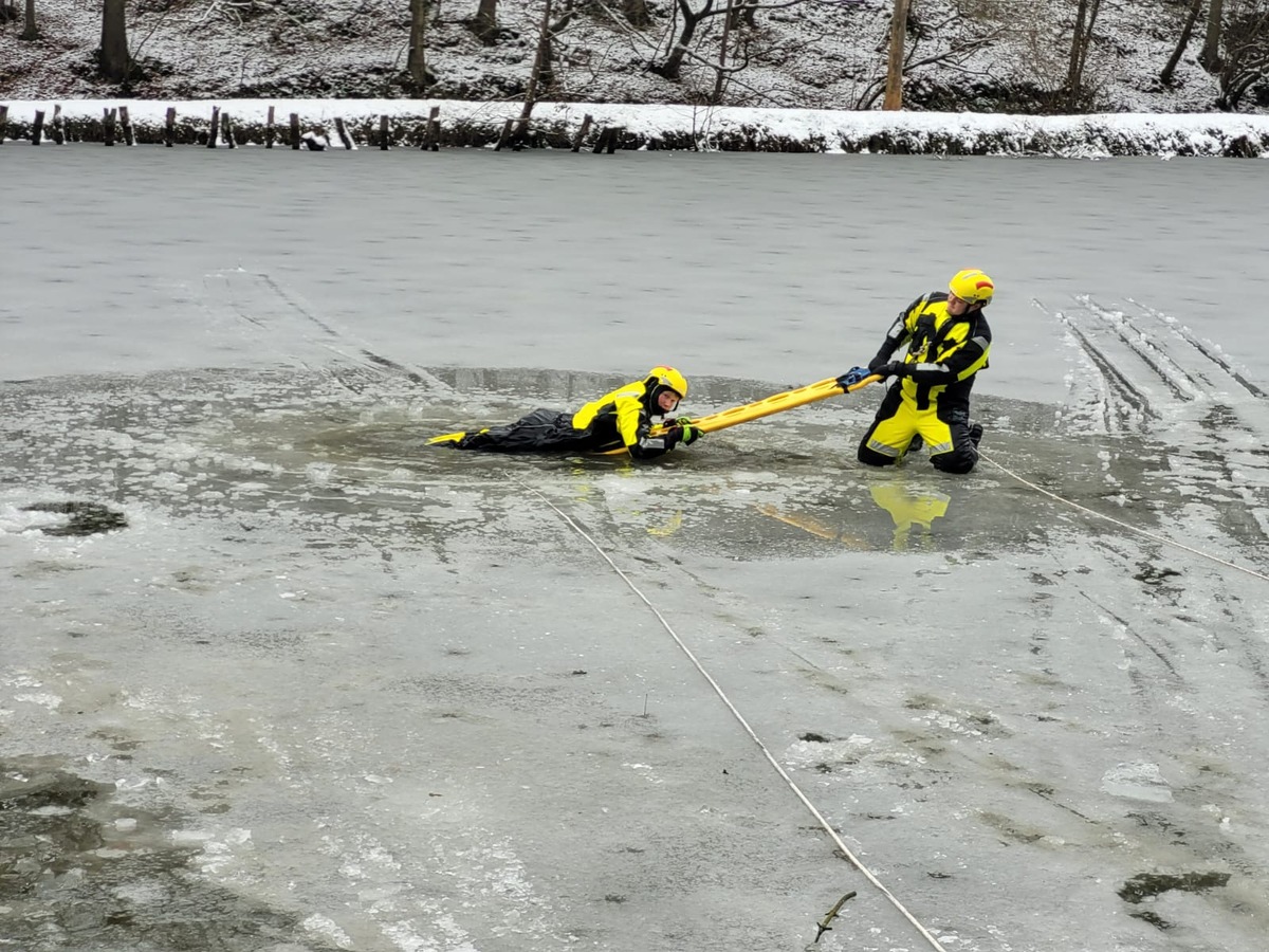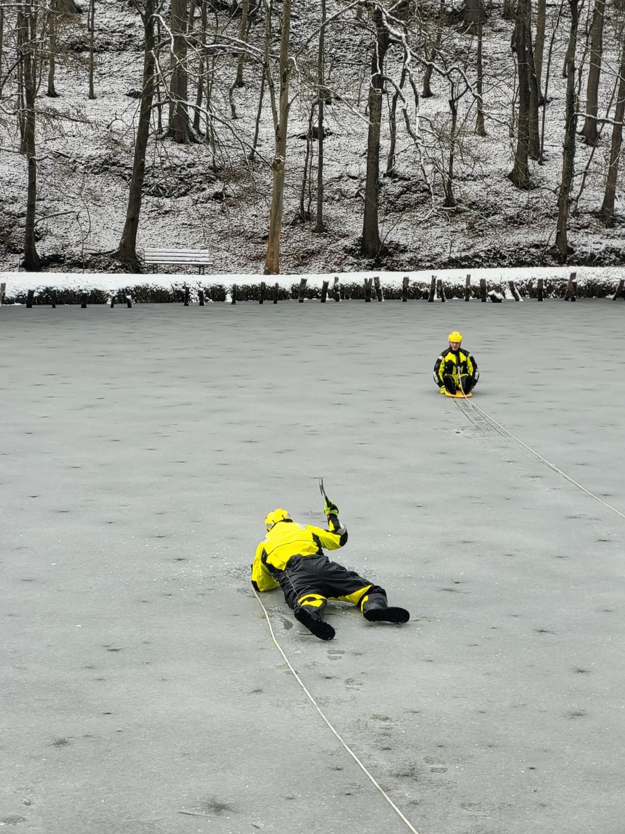 Diesen besonderen Umstand nahm die Löscheinheit Stadt Blankenberg der Feuerwehr Hennef zum Anlass, die Menschenrettung auf einem zugefrorenen Teich zu üben.