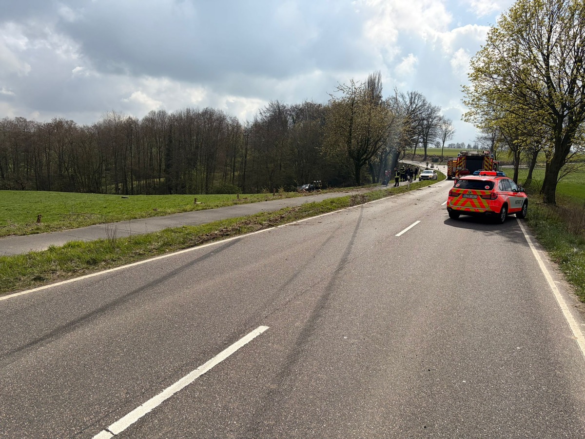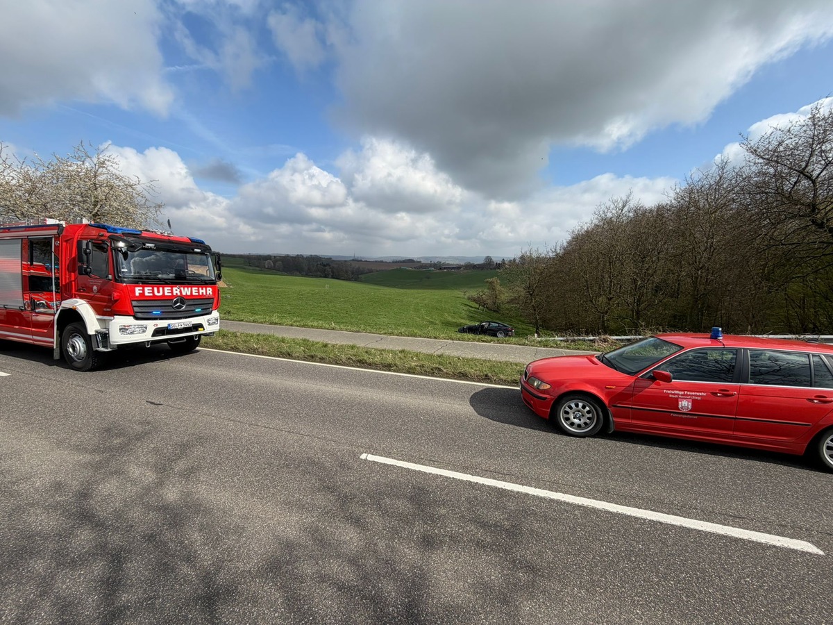 Ein PKW kam aus bislang ungeklärter Ursache von der Fahrbahn ab, verfehlte einen Baum am Straßenrand knapp und kam nach rund 100 Metern auf einer angrenzenden Wiese zum Stillstand. Das Fahrzeug wurde dabei erheblich beschädigt.