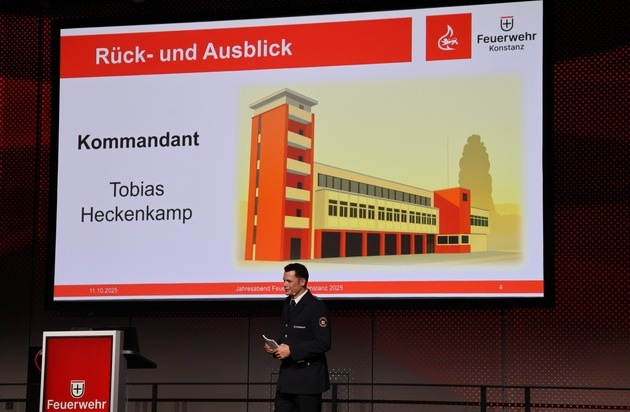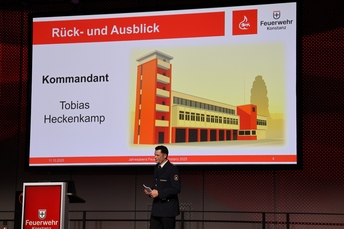 Kommandant Tobias Heckenkamp eröffnete den Abend mit einem Rückblick auf ein einsatzreiches Jahr, welches die Feuerwehr Konstanz immer wieder gefordert hat. Neben zahlreichen Brand- und Hilfeleistungseinsätzen blieben insbesondere einige außergewöhnliche Einsätze in Erinnerung. So musste ein Chamäleon aus einem Baum gerettet werden, und auch ein vermeintliches Krokodil nahe des Bodensees sorgte für Aufsehen, stellte sich jedoch als harmlos heraus.