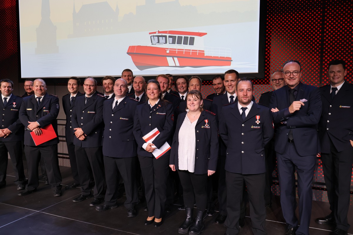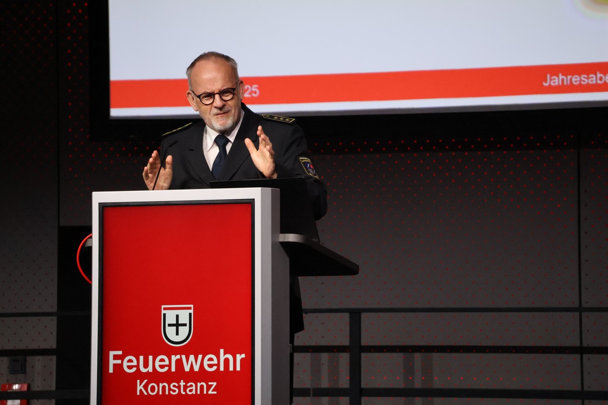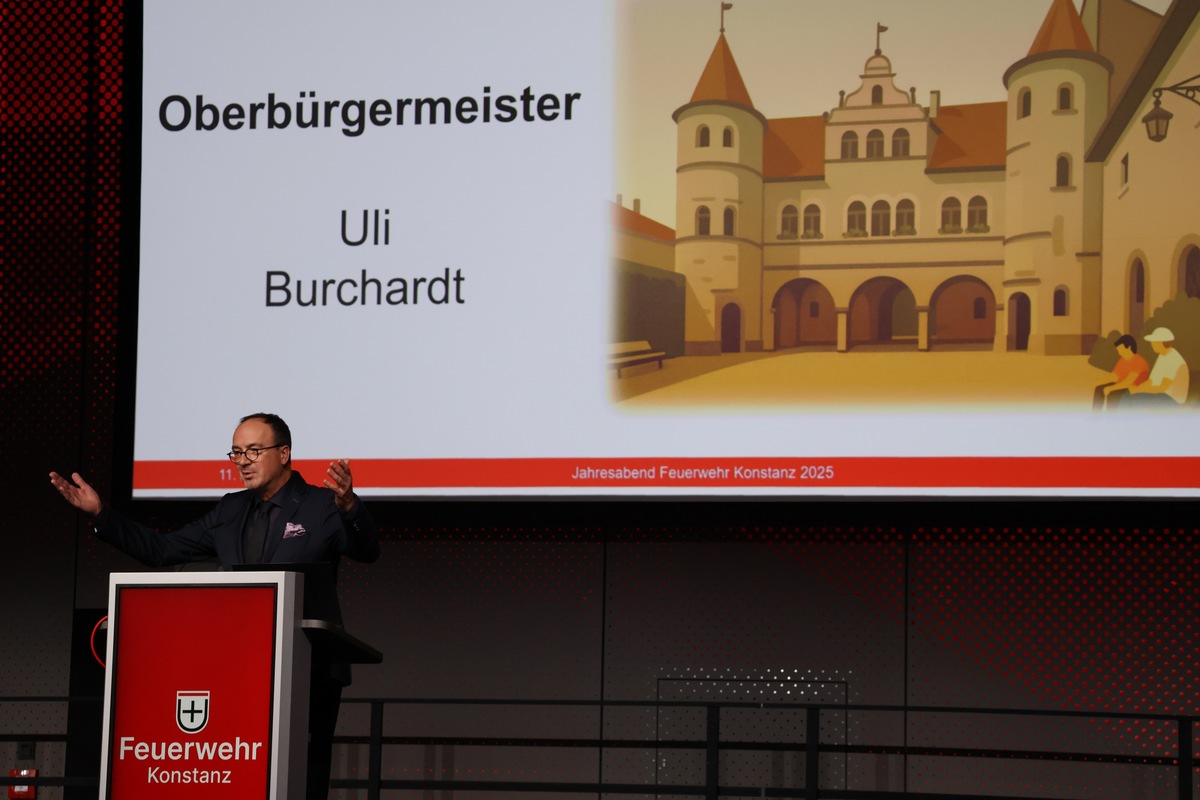 Oberbürgermeister Uli Burchardt würdigte in seinem Grußwort die Arbeit der Feuerwehr als "Vorbild für unsere Gesellschaft". Er betonte, dass die Feuerwehr Werte wie Zusammenhalt, Hilfsbereitschaft und Verantwortung täglich lebe und damit ein Beispiel für gelebte Gemeinschaft sei. Er sprach den Feuerwehrangehörigen "größten Respekt und Anerkennung" für ihr unermüdliches Engagement aus und dankte zugleich den Familien und Arbeitgebern, die dieses Ehrenamt durch ihre Unterstützung ermöglichen. Trotz der schwierigen Haushaltslage sichere die Stadt Konstanz zu, auch künftig die notwendigen Mittel bereitzustellen, um die Feuerwehr optimal auszustatten. Zum Ende der Rede folgte ein weiterer Höhepunkt des Abends.