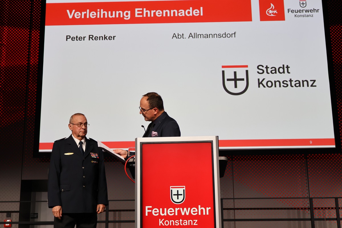 Oberbürgermeister Uli Burchardt verlieh Peter Renker die Ehrennadel der Stadt Konstanz für sein herausragendes ehrenamtliches Engagement. Peter Renker war über Jahrzehnte in verschiedenen Funktionen im Feuerwehrwesen, bei der Bundeswehr und im Kreisfeuerwehrverband aktiv. Die Gäste applaudierten ihm mit Standing Ovations.