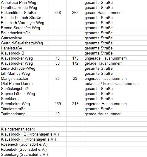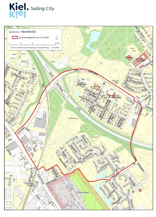 Samstag entschärft der Kampfmittelräumdienst in Kiel-Suchsdorf eine Fliegerbombe. 1740 Personen aus 860 Haushalten müssen ihre Wohnungen und Häuser verlassen. Insgesamt liegen 505 Adresspunkte (inkl. Wirtschaftsgebäude und sonstigen Gebäude) und fünf Kleingartenanlagen in dem Evakuierungsgebiet.