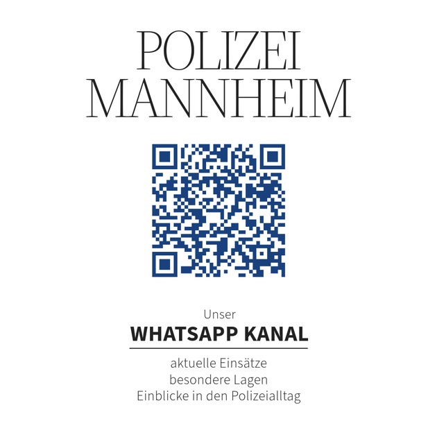 Über den seit Mai vergangenen Jahres bestehend WhatsApp-Kanal "Polizei BW Mannheim" wird bereits regelmäßig über aktuelle Einsätze, besondere Lagen und den Arbeitsalltag der Beamtinnen und Beamten im gesamten Zuständigkeitsbereich des Polizeipräsidiums Mannheim berichtet.