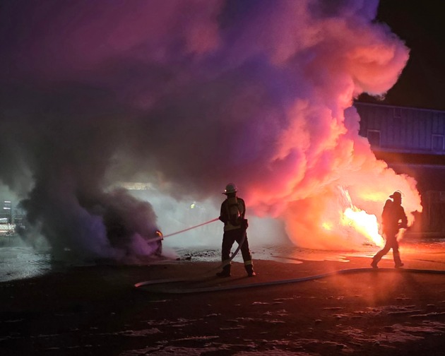Bei Eintreffen der Einsatzkräfte bestätigte sich die Meldung. Zwei Fahrzeuge mit Verbrennungsmotor brannten im Bereich des Motors in Vollbrand. Die Gefahr einer Ausbreitung auf weitere Fahrzeuge bestand nicht. Im Rahmen der Brandbekämpfung kamen zwei C-Rohre zum Einsatz. Zur Brandursache kann die Feuerwehr keine Angaben machen.