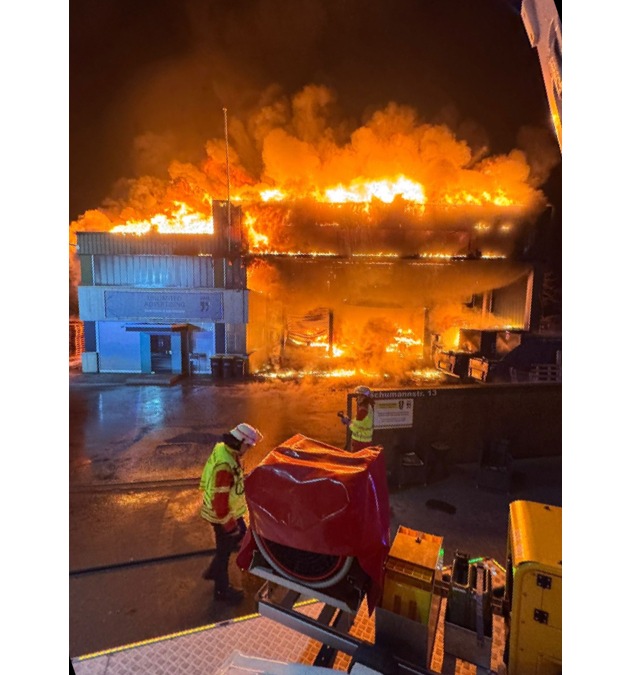 Am Sonntagmorgen, den 25.01., wurde die Feuerwehr Minden um 03:38 Uhr zu einem gemeldeten Brand im Industriegebiet Hahlen Ost gerufen. Bei Eintreffen der ersten Kräfte der Berufsfeuerwehr Minden stand ein Lagerhaus mit den Ausmaßen 25x75 m an der Schumannstraße bereits im Vollbrand. Die Hitzeentwicklung war bereits so stark, dass Fensterscheiben einer angrenzenden Wohnbebauung barsten. Zeitweise wurden die Bewohner mehrerer Bungalows durch die Feuerwehr aufgefordert ihre Häuser zu verlassen. Da schnell klar war, dass sich keine Personen im betroffenen Bereich aufhielten und ein Niederschlagen des Brandes durch einen Innenangriff nicht mehr möglich war, lag der Schwerpunkt der Maßnahmen zunächst auf der Verhinderung der weiteren Schadensausbreitung.
