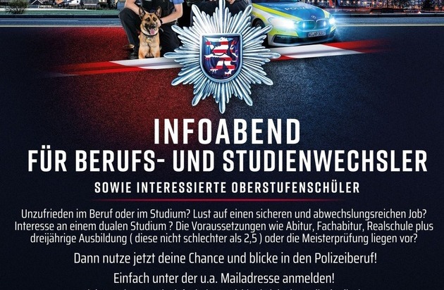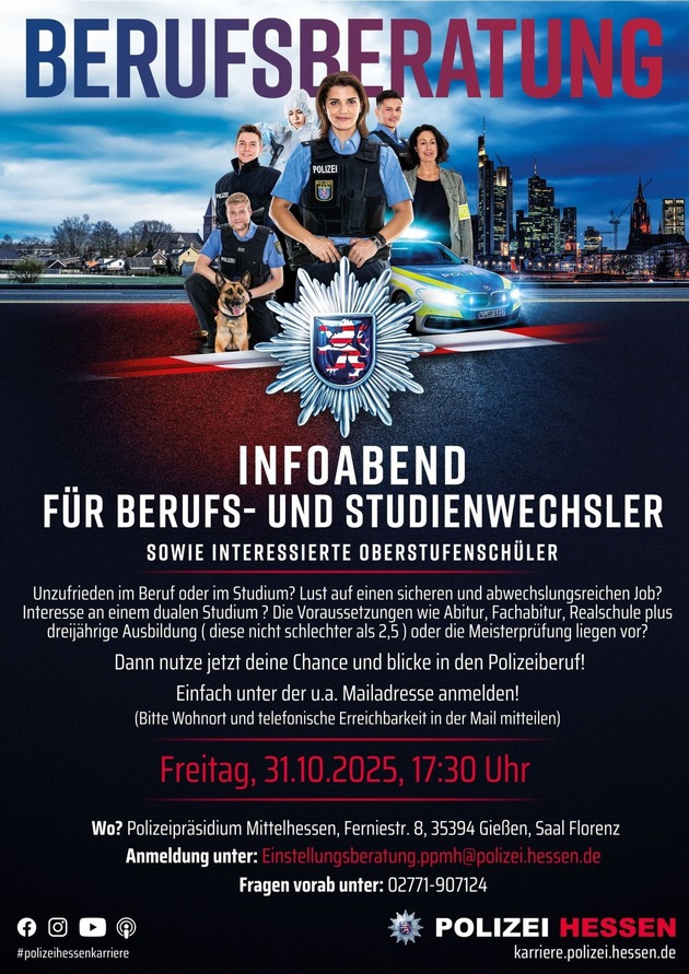 Bereits zum wiederholten Mal bietet die mittelhessische Polizei eine Veranstaltung der besonderen Art an. Nach den erfolgreichen Veranstaltungen in den vergangenen Jahren, lädt die Einstellungsberatung des Polizeipräsidiums Mittelhessen, am Freitag, 31.Oktober, ab 17.30 Uhr, erneut einen Informationsabend für Interessierte in das Gießener Präsidium ein. Das Angebot im Saal Florenz richtet sich hauptsächlich an Personen, die mitten im Berufsleben stehen oder derzeit noch studieren. Aber selbstverständlich können sich auch Schülerinnen und Schüler der Oberstufe an dem Abend einen Einblick verschaffen, sollten noch Plätze frei sein.