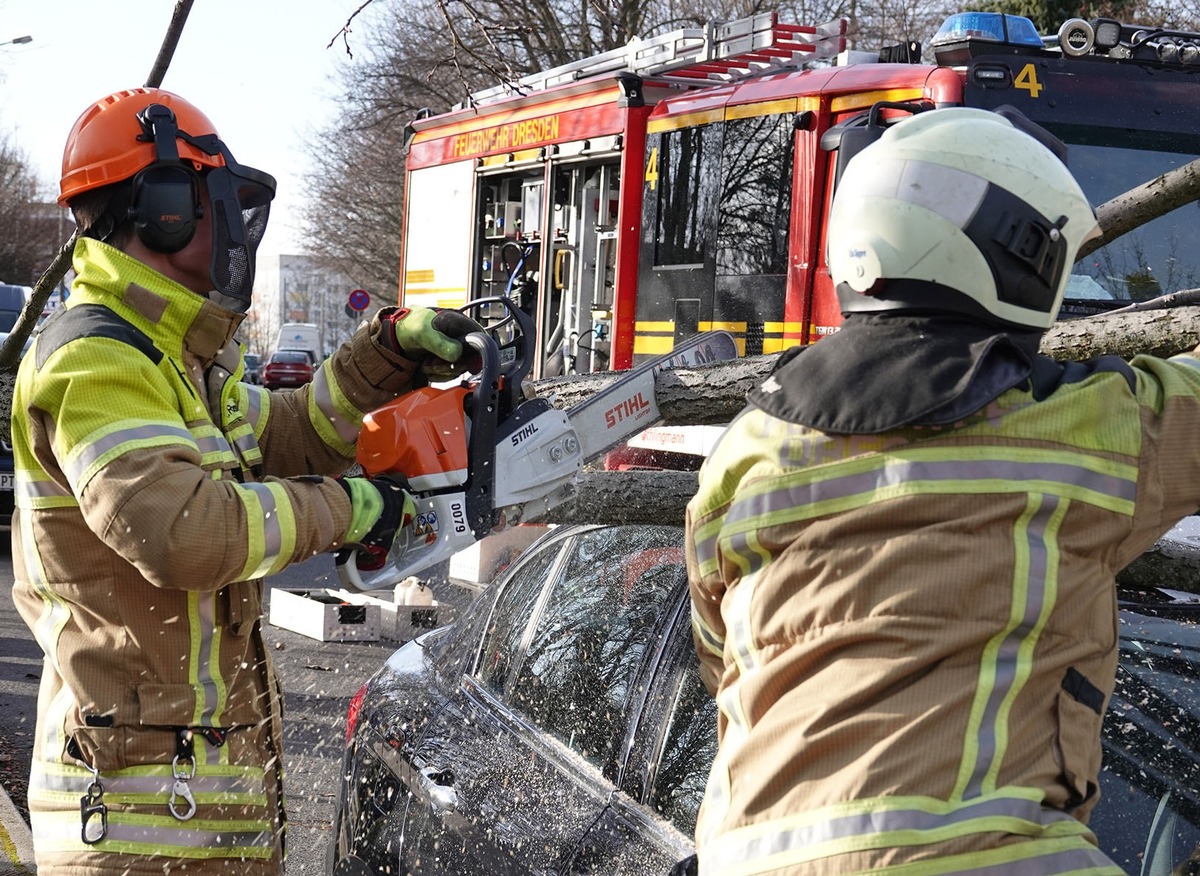 Die Feuerwehr Dresden wurde im gleichen Zeitraum zu vier Brandeinsätzen alarmiert. 36 weitere Einsätze entfielen auf technische Hilfeleistungen, darunter die Unterstützung bei Verkehrsunfällen, das Beseitigen ausgelaufener Betriebsmittel sowie Tragehilfen für den Rettungsdienst. Am Vormittag zog zudem ein Sturmtief über das Stadtgebiet, vor dem der Deutsche Wetterdienst im Vorfeld gewarnt hatte. In mehreren Stadtteilen stürzten infolgedessen Bäume um. Gegen 10 Uhr rückten Einsatzkräfte der Feuer- und Rettungswache (FuRW) Übigau sowie der Stadtteilfeuerwehr Wilschdorf auf die Hubertusstraße aus. Dort war eine etwa 25 Meter hohe Linde auf die Friedhofsmauer gestürzt. Zudem wurden rund 100 Meter Leitung der Straßenbeleuchtung beschädigt. Der Baum wurde mit Motorkettensägen zerkleinert und die Gefahrenstelle beseitigt. Etwa eine Stunde später wurden die Einsatzkräfte der FuRW Striesen sowie der Stadtteilfeuerwehr Bühlau auf die Bautzner Straße gerufen. In Höhe der Mordgrundbrücke war ein rund sechs Meter langer Ast einer Buche auf Gehweg und Fahrbahn gestürzt und hatte dabei einen Stromverteilerkasten beschädigt. Auch hier wurde die Gefahr mit Motorkettensägen beseitigt. In Rockau brach eine Weide ab und blockierte die Fahrbahn vollständig. Die Stadtteilfeuerwehr Rockau entfernte die Bruchstücke. Insgesamt mussten 13 sturmbedingte Einsätze durch die Berufs- und Freiwillige Feuerwehr Dresden abgearbeitet werden. Darüber hinaus kam es zu vier Fehlalarmen, die durch automatische Brandmeldeanlagen ausgelöst wurden.