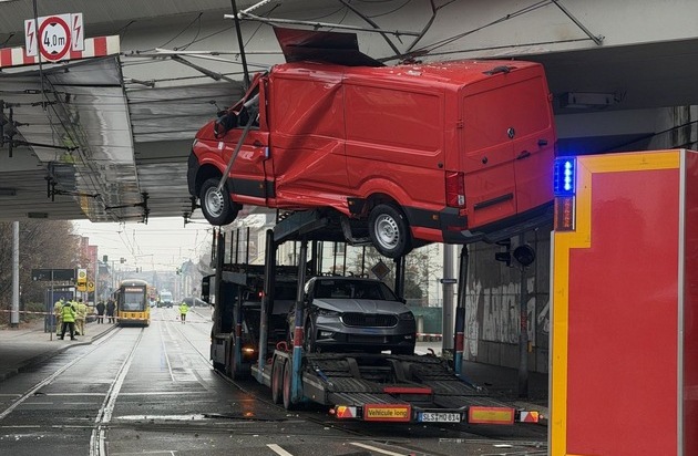 Die Feuerwehr Dresden wurde heute zu einem ungewöhnlichen Hilfeleistungseinsatz alarmiert. Aus noch zu ermittelnder Ursache blieb der Fahrer eines Fahrzeugtransporters mit Anhänger unter einer Brücke in Höhe der Industriestraße stecken. Dabei wurde der Fahrdraht der Straßenbahn beschädigt. Zudem wurde ein auf dem Anhänger transportierter Kleintransporter so weit nach hinten gedrückt, dass er abzustürzen drohte.