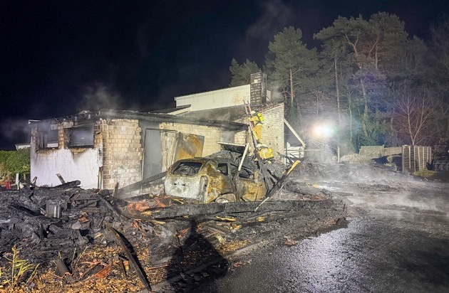 Die Ortsfeuerwehren Heilshorn und Garlstedt wurden am 17.01. um 22:07 Uhr mit dem Stichwort "Garagenbrand" in den Sandbergweg nach Heilshorn alarmiert. Bei Eintreffen der ersten Kräfte stand ein Carport, der unmittelbar an ein Wohnhaus grenzte, im Vollbrand. Zwei Personen hatten sich bereits selbstständig aus Gebäude gerettet, weitere Personen befanden sich nicht im Gebäude. Im Carport befanden sich ein Pkw, zwei Motorräder, sowie mehrere Gasflaschen. Da die Flammen begannen, sich auf das Dach des Wohnhauses auszubreiten, wurde das Alarmstichwort erhöht und die Feuerwehren Osterholz-Scharmbeck und Scharmbeckstotel mit zur Einsatzstelle alarmiert. Mit mehreren Rohren im Innen- sowie Außenangriff wurde die Brandbekämpfung vorgenommen, zudem kam der leistungsfähige Frontmonitor des Garlstedter Tanklöschfahrzeuges zum Einsatz, mit dem großen Mengen Wasser in den Carport abgegeben werden konnten. Die Einsatzkräfte nahmen Teile der Dachhaut des Wohnhauses auf und löschten die betroffenen Bereiche einzeln ab. Es gelang, ein weiteres Übergreifen auf das restliche Gebäude zu verhindern. Mit schwerem Räumgerät wurden die Reste des Carports auseinandergezogen und einzeln abgelöscht. Die zur Einsatzstelle alarmierten Versorgen stellten Strom- und Gas ab, zudem wurde die untere Wasserbehörde zur Einsatzstelle alarmiert. Diese beauftragte zusätzliche eine Spezialfirma mit der Aufnahme des kontaminierten Löschwassers und der Reinigung der Einsatzstelle. Diese konnte um 02:28 Uhr an die Polizei übergeben. Die vier Ortsfeuerwehren, die mit rund 70 Einsatzkräften und acht Fahrzeugen vor Ort waren, konnten wieder einrücken.