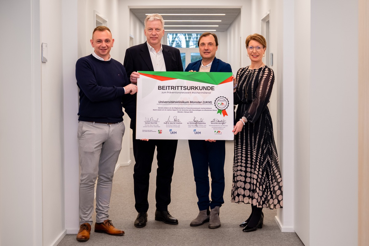 Münster (ukm/lwi). Mit Beginn des Jahres 2026 hat sich das UKM (Universitätsklinikum Münster) dem Präventionsnetzwerk "Sicher im Dienst" des Landes NRW angeschlossen, dem aktuell mehr als 2700 Beteiligte aus 1000 verschiedenen Bereichen des öffentlichen Dienstes angehören.