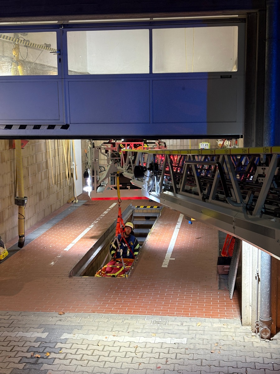 Sie kommt zum Einsatz, wenn der Korb entlang einer Gebäudeseite oder an einer Ecke vorbeigeführt werden muss, beispielsweise wenn eine frontale Aufstellung nicht möglich ist. So lässt sich auch bei beengten Platzverhältnissen eine sichere Rettung durchführen.