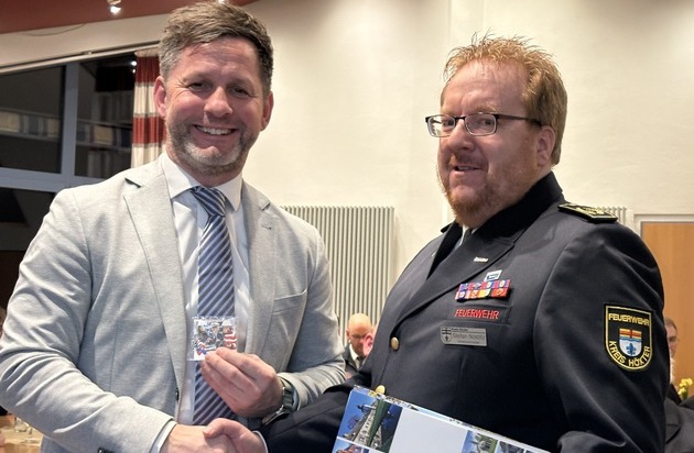 In seinem Jahresbericht stellte Kreisbrandmeister Stefan Nostitz die Bedeutung von Auszeichnungen als Symbol der Wertschätzung heraus. Er berichtete von 161 Einsätzen der Psychosozialen Notfallversorgung mit insgesamt 563 Einsatzstunden sowie von zahlreichen Lehrgängen und Großübungen auf Kreisebene. Dazu zählten unter anderem eine MANV-Übung in Erkeln, der Blaulichttag in Rimbeck mit rund 200 Einsatzkräften sowie eine Großübung mit Behandlungsplatz in Steinheim. Positiv erwähnte er auch die Erfolge der DKMS-Aktion aus dem Jahr 2024, aus der bereits 24 Stammzellenspenden hervorgegangen sind. Zudem berichtete er über die vom Kreis beschaffte Drohne, die sich aufgrund häufiger Einsätze bewährt hat. Vor dem Hintergrund aktueller Ereignisse übergab er den "Respekt"-Pin der Kampagne "NRW zeigt Respekt gegenüber Einsatzkräften" des Innenministeriums NRW an Bürgermeister Tino Wenkel als sichtbares Zeichen der Wertschätzung und Solidarität.