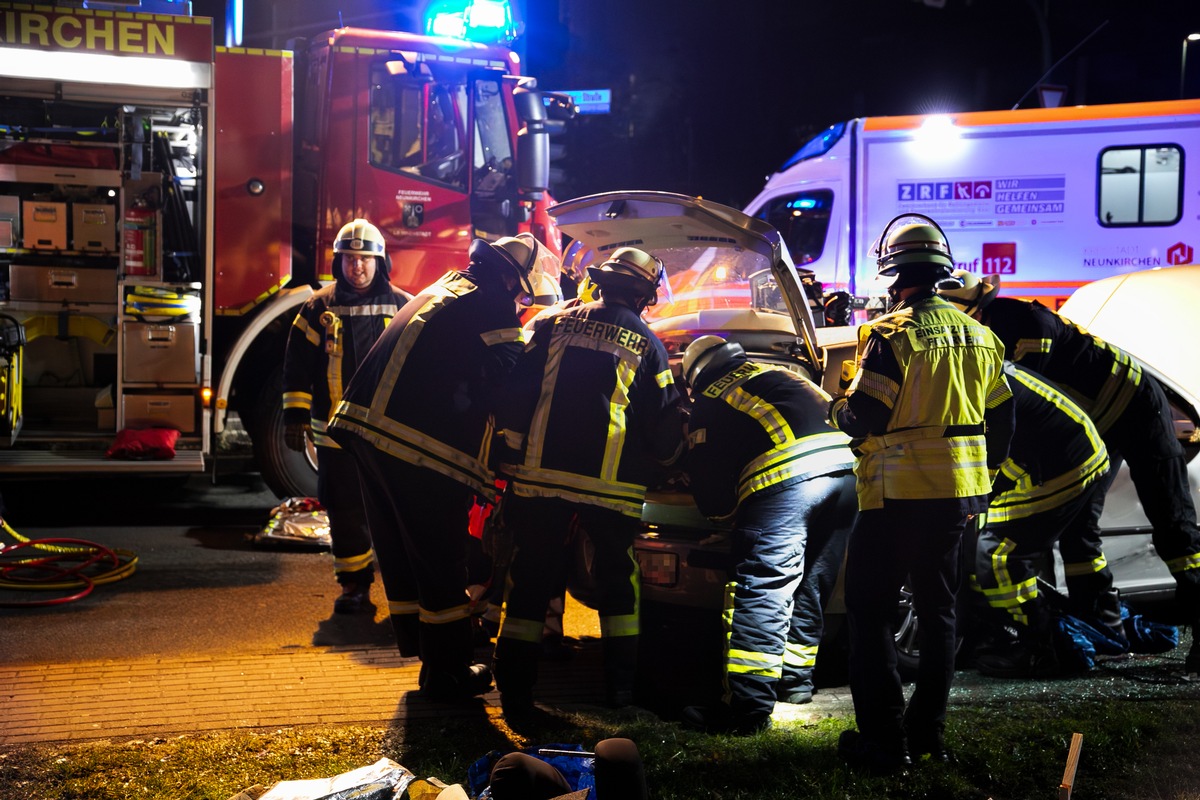 FW LK Neunkirchen: Drei Verletzte bei Unfall - Feuerwehr rettet Schwerverletzte aus Wrack