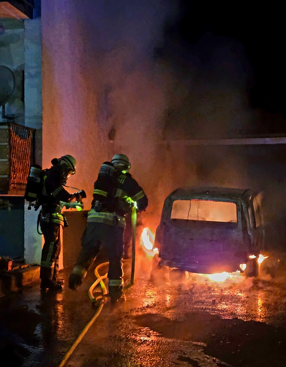 Beim Eintreffen der Einsatzkräfte konnte ein im Eingangsbereich eines Anwesens abgestellter PKW in Vollbrand festgestellt werden. Umgehend wurde ein Atemschutztrupp zur Brandbekämpfung eingesetzt, der das Fahrzeug zügig ablöschte.