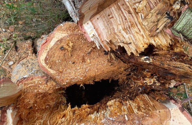 Nach der ersten Erkundung durch die Einsatzkräfte bestätigte sich die Lage: Eine etwa 50 Zentimeter starke Birke hatte sich bereits im Erdreich gelockert und neigte sich gefährlich in Richtung des Gebäudes. Um eine akute Gefahr für Personen und Sachwerte abzuwenden, wurde der Baum zunächst mittels eines Mehrzweckgreifzuges gesichert. Anschließend erfolgte eine kontrollierte Fällung: Mit der Motorsäge wurde der Stamm angekerbt und die Birke über den Greifzug gezielt vom Gebäude weggezogen.