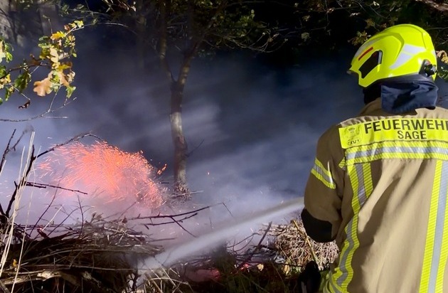 Am Samstagabend um 19:56 Uhr wurde die Feuerwehr Sage zu einem Brandeinsatz in die Straße Zur Sager Heide alarmiert. Auf einem Privatgrundstück war aus bislang unbekannten Gründen ein Streifen aus Ästen, aufgehäuftem Laub und Gartenabfällen in Brand geraten.