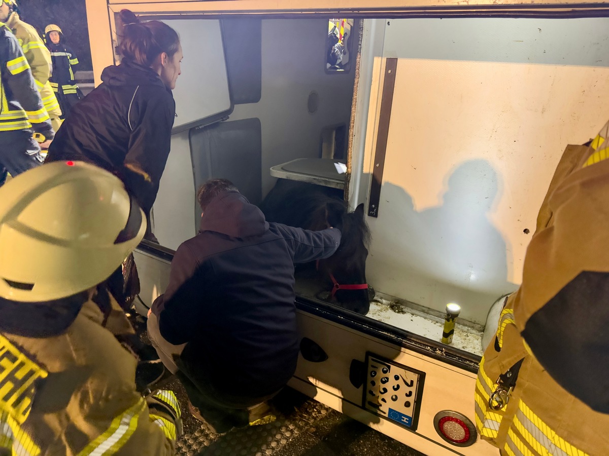 Um eine sichere Rettung der Tiere zu ermöglichen, ließ der Einsatzleiter umgehend zwei Veterinäre zur Unfallstelle nachfordern. Erst nach der Gabe von Beruhigungsmitteln war es möglich, die Transportboxen gefahrlos zu öffnen und die Pferde schonend zu befreien. Gegen 22:30 Uhr konnten beide Tiere weitestgehend unverletzt gerettet und in einen bereitgestellten Pferdeanhänger umgeladen werden.