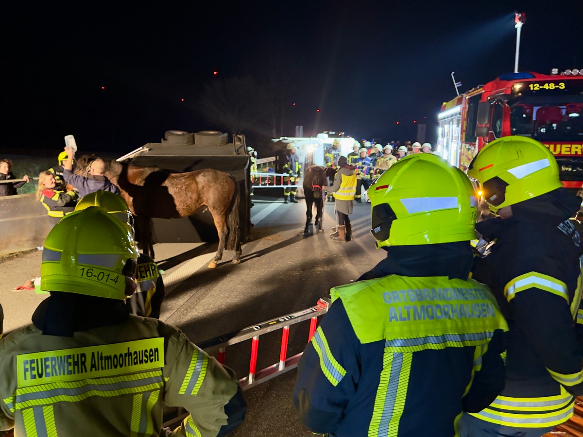 Beim Eintreffen der ersten Rettungskräfte zeigte sich, dass der ungarische Fahrer den Kleintransporter bereits nahezu unverletzt und aus eigener Kraft verlassen hatte. Bestätigt wurde jedoch, dass sich sowohl im Transporter als auch im Anhänger jeweils ein Pferd befand. Beide in liegender Position und augenscheinlich stark verängstigt.