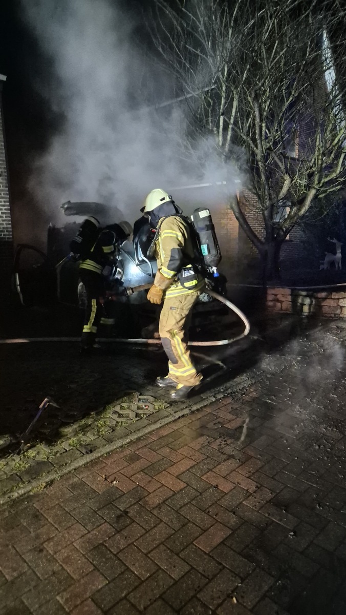 Nach einem zunächst ruhigen Jahreswechsel rückten die Freiwillige Feuerwehren in der Silvesternacht zu zwei Brandeinsätzen aus. Gegen 02:00 Uhr alarmierte die Leitstelle die Feuerwehr Achternmeer zur Unterstützung der Freiwilligen Feuerwehr Jeddeloh II. An einem Wohngebäude waren auf einer Terrasse mehrere Fahrräder in Brand geraten. Durch das schnelle Eingreifen der Einsatzkräfte verhinderten diese ein Übergreifen der Flammen auf das Wohngebäude. Nach Abschluss der Löscharbeiten und notwendiger Nachkontrollen verließen die Einsatzkräfte die Einsatzstelle nach rund einer Stunde. Eine weitere Alarmierung folgte gegen 03:15 Uhr für die Freiwillige Feuerwehr Wardenburg. In Hundsmühlen brannte ein Fahrzeug unmittelbar an einem Wohnhaus. Beim Eintreffen der Feuerwehr stand der PKW bereits in Vollbrand und wurde von einem Trupp unter schwerem Atemschutz abgelöscht. Im Anschluss kontrollierten die Einsatzkräfte das angrenzende Gebäude. Mithilfe der Drehleiter der Berufsfeuerwehr Oldenburg überprüfte die Feuerwehr, ob sich das Feuer auf das Gebäude oder den Dachstuhl ausgedehnt hatte - dies war nicht der Fall. Die noch im Feuerwehrhaus verbliebenen Kameraden der Freiwilligen Feuerwehr Achternmeer unterstützten die Feuerwehr Wardenburg bei den Löscharbeiten. Polizei und Rettungsdienst waren ebenfalls vor Ort. Nach Abschluss des Einsatzes traten die letzten eingesetzten Einsatzkräfte gegen 05:00 Uhr die Heimreise an.