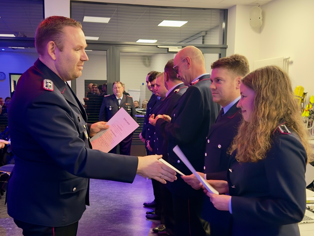Im Rahmen der Umstellung auf die neuen Regelungen der Feuerwehrverordnung des Landes Niedersachsen wurde allen anwesenden Feuerwehrleuten ihr neuer Dienstgrad überreicht. Dies galt gleichermassen für die Einsatz- als auch die Altersabteilung. Zahlreiche Kameradinnen und Kameraden wurden gleichzeitig auch befördert.