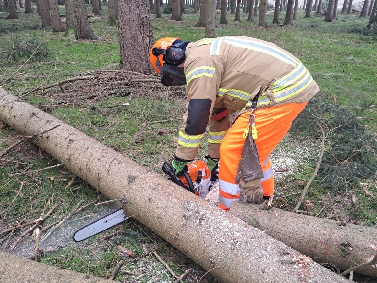 Am heutigen Sonderdienst nahmen insgesamt 13 Einsatzkräfte in der Zeit von 08:00 bis 16:00 Uhr teil. Die Teilnehmer waren den Modulen A bis C zugeordnet. Diese Module definieren die jeweiligen Befugnisse beim Arbeiten mit der Motorkettensäge - vom Sägen von liegendem Holz bis zu einer bestimmten Stärke, über das Fällen kleiner stehender Bäume bis hin zu Arbeiten aus dem Korb der Drehleiter.