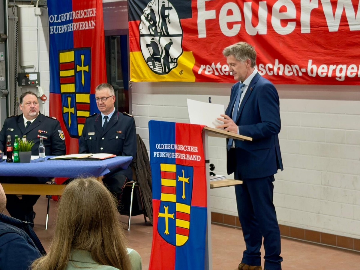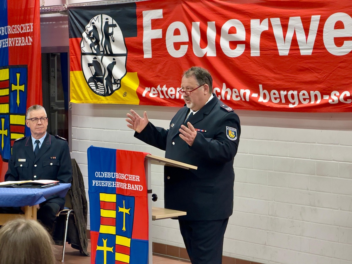 Der Kreisfeuerwehrverband Landkreis Oldenburg hat am 6. März 2026 seine jährliche Vertreterversammlung im Feuerwehrhaus Neerstedt in der Gemeinde Dötlingen abgehalten. Verbandsvorsitzender Reiner Schröder eröffnete und leitete die Versammlung. Unter den Gästen waren Landrat Dr. Christian Pundt, die stellvertretende Bürgermeisterin der Gemeinde Dötlingen Tomke Rothe, Regierungsbrandmeister Udo Schwarz sowie Vertreterinnen und Vertreter aus Rat und Verwaltung. Den Mittelpunkt der Versammlung bildete der Tätigkeitsbericht von Kreisbrandmeister Frank Hattendorf, der einen umfassenden Überblick über das Einsatzjahr 2025 gab.