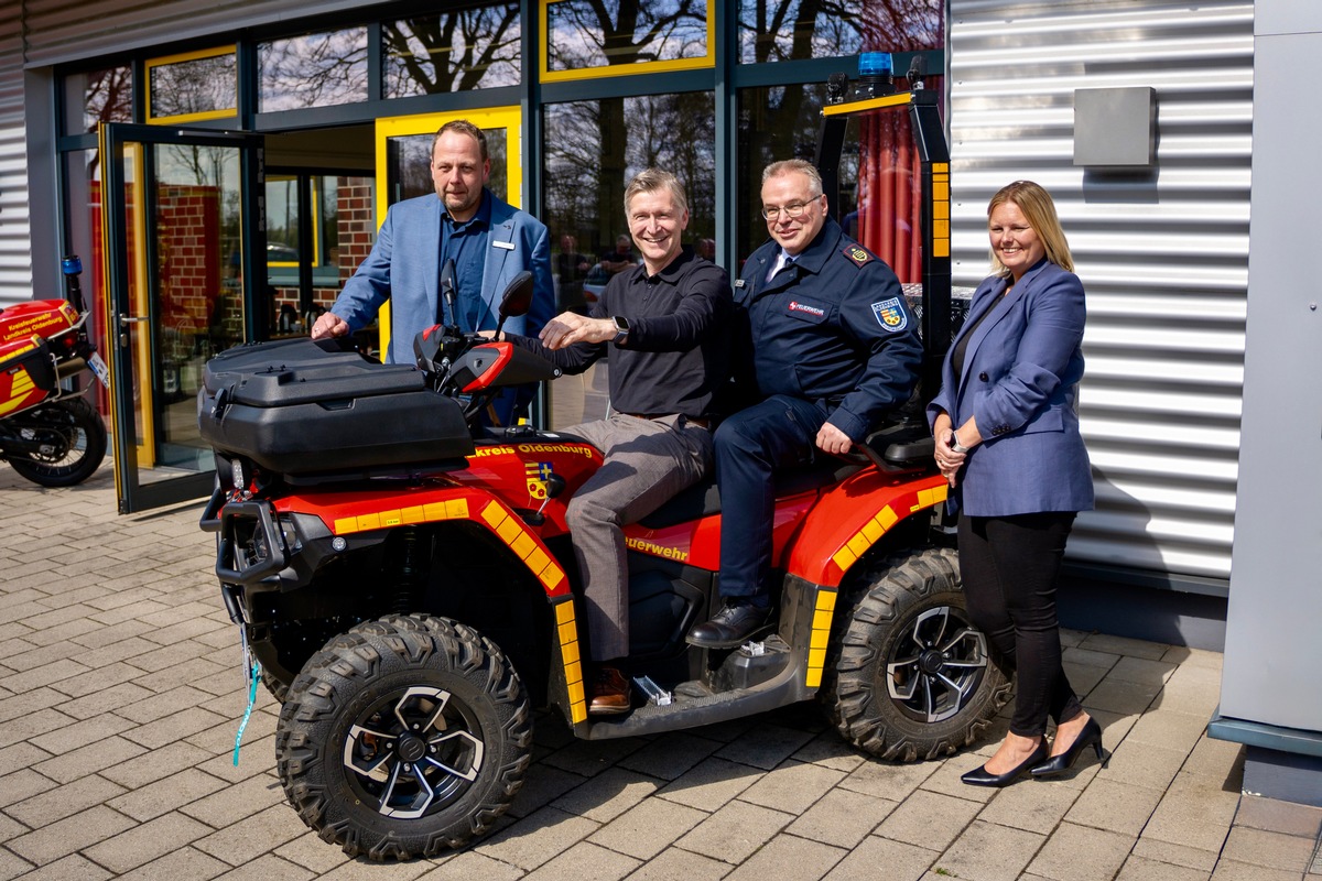 Besonderes Interesse galt auch einem Quad und einem Motorrad, die für spezielle Einsatzlagen vorgesehen sind. Landrat Dr. Christian Pundt ließ es sich nicht nehmen, das Quad persönlich zu testen und drehte eine Runde über das Gelände.