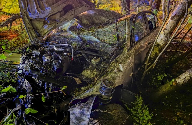 Beim Eintreffen der Einsatzkräfte stellte sich heraus, dass sich die verunfallte Person eigenständig aus dem stark beschädigten Fahrzeug befreien konnte. Mit letzter Kraft gelang es ihr, sich aus dem Wald bis zur Autobahn zu schleppen und dort vorbeifahrende Fahrzeuge auf sich aufmerksam zu machen. Die Feuerwehr leuchtete umgehend die Einsatzstelle aus und suchte den Nahbereich mithilfe einer Wärmebildkamera nach weiteren möglichen Beteiligten ab. Glücklicherweise konnten keine weiteren Personen festgestellt werden. Der Unfallhergang zeigte ein außergewöhnlich hohes Maß an Wucht: Das Fahrzeug war offenbar nahezu hochkant in die Bäume eingeschlagen. Das Dach wurde massiv eingedrückt, sodass es als nahezu unglaublich gilt, dass die Person den Unfall überleben und sich selbst befreien konnte. Während der Rettungsmaßnahmen sperrte die Polizei eine Fahrspur der Autobahn. Die verletzte Person wurde durch den Rettungsdienst vor Ort medizinisch erstversorgt und anschließend in ein Krankenhaus transportiert. Die Ermittlungen zur genauen Unfallursache dauern an.