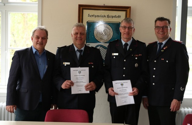 Im Rahmen einer kleinen Feierstunde ernannte Samtgemeindebürgermeister Yves Nagel die beiden erneut für weitere sechs Jahre zum Ortsbrandmeister beziehungsweise stellvertretenden Ortsbrandmeister und berief sie in das Ehrenbeamtenverhältnis.