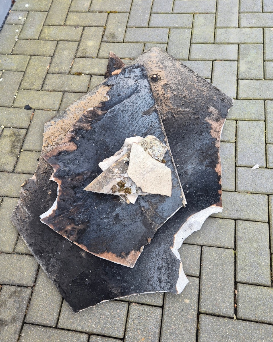 Durch die starke Hitzeentwicklung kam es dazu, dass Teile der Verkleidung im Kaminbereich auf dem Dach abgeplatzt sind.