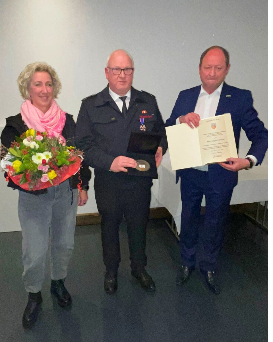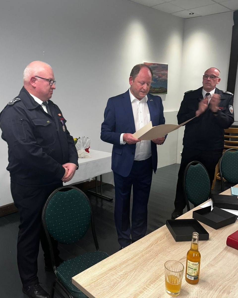 Darüber hinaus erhielt er aus den Händen des Kreisbrandmeisters Thomas Wienecke sowie seines Stellvertreters Ralf Schwane das Feuerwehr-Ehrenkreuz des Deutschen Feuerwehrverbandes in Silber - eine Auszeichnung, die seinen langjährigen und besonderen Einsatz auf eindrucksvolle Weise würdigt.