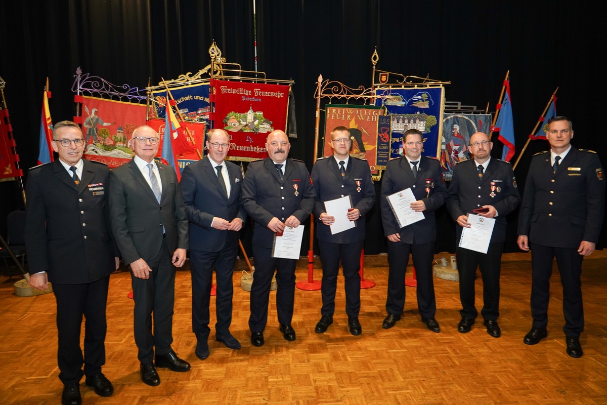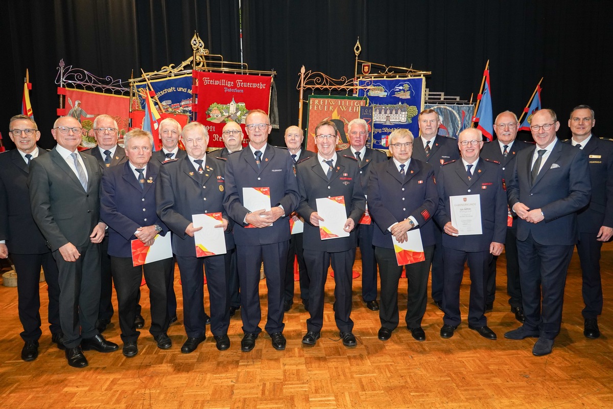 (sg) Im Rahmen der Jahreshauptversammlung der Gesamtwehr der Feuerwehr Paderborn am 13. März 2026 in der Bürgerhalle in Elsen konnten zahlreiche Mitglieder und Unterstützer für ihre langjährige Treue und besonderen Verdienste um das Feuerwehrwesen geehrt werden. Die Verleihung des Ehrenzeichens in Gold des Landes Nordrhein-Westfalen für 35-jährige Mitgliedschaft im aktiven Dienst wurde gleich vier Mal vergeben. Ausgezeichnet wurden Tobias Hillen, Markus Pahls, Dirk Schlichting und Sven Wetter. Ein Mitglied unserer Feuerwehr erhielt das Ehrenzeichen in Gold mit Goldkranz für beeindruckende 50 Jahre im aktiven Dienst: Reinhard Kurte